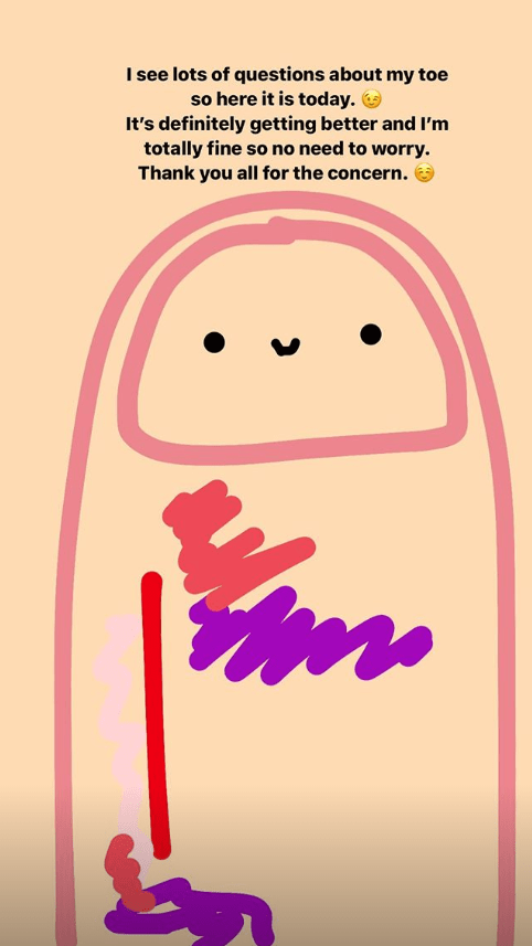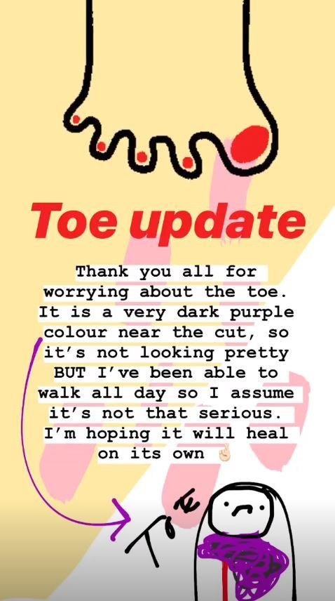 Marzia同時也透露:「這一點也不好玩」,並呼籲粉絲們在使用刀具時要小心。而動態一發出,立刻有引來大批粉絲相當擔憂,讓Marzia也趕緊再度發出動態,更新自己傷口的狀況。她簡單繪製了示意圖,表示自己相當感謝粉絲們關心她的腳趾頭,也透露現在切口附近呈現非常深的紫色,所以看起來不是很美觀,但是Marzia也強調,自己現在行動自如,整天走路也沒有問題,所以她認為傷口並不如外表上看起來那麼嚴重,也希望傷口能自行痊癒。