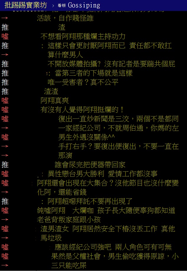 而網友對於謝忻復出的事在PTT展開熱烈討論,紛紛留言表示,「阿翔好爽喔!吃飽喝足拍拍屁股走人」、「反觀阿翔好運!似乎沒甚麼影響」、「浩角翔起的吸金能力比較強,一定是選擇犧牲謝忻保浩角翔起」、「不覺得阿翔看起來有夠78嗎」、「不想看阿翔那種爛主持功力」、「有沒有人覺得阿翔挺爛的!」、「純噓阿翔~大爛咖!孩子長大隨便辜狗都知道!」。