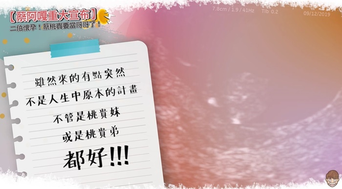 二伯也講出心中期盼,希望第二胎可以是女生,一男一女剛剛好!事實上,蔡阿嘎在產檢時,早就悄悄地暴露心聲,不斷喊著「沒有雞雞」!影片最後也提到,「不管是桃貴妹,或是桃貴弟,都好!」期盼小朋友的到來,也盼二伯、寶寶能一切順利、健康、平安。