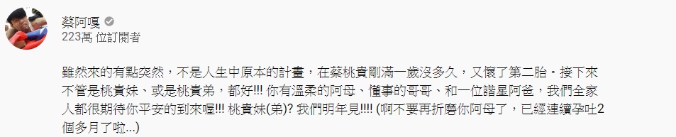 事實上,今年4月蔡阿嘎才在10週年Q&A中表示,沒有再生的打算,沒想到隔幾個月的時間,「意外」悄悄來報到!蔡阿嘎在影片中表示,二胎完全是意料之外,目前也已超過三個月。雖然蔡阿嘎頻頻直呼二胎完全是說來就來,毫無防備,但蔡桃貴從此有弟弟或妹妹陪伴,是件很好的事。