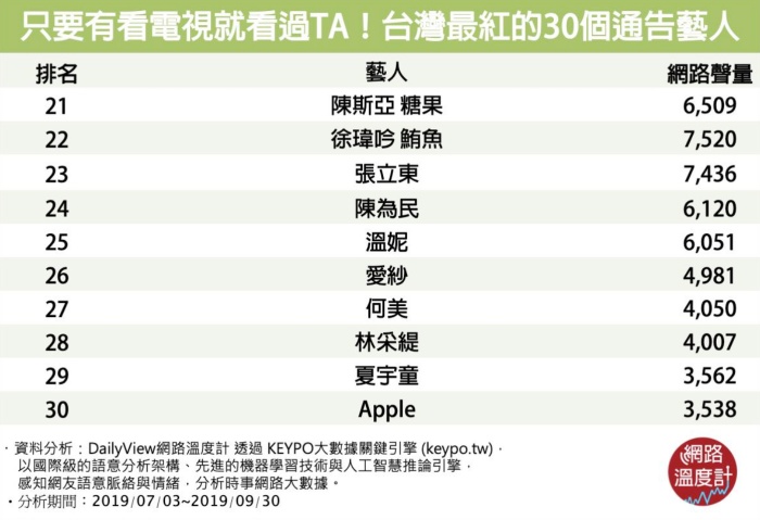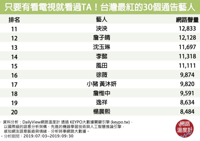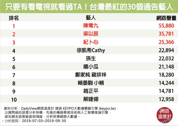 台灣綜藝節目琳瑯滿目,藝人想提升知名度、爭取曝光率,錄影表現突出自然是不二法門。究竟哪些通告咖紅遍大街小巷,不僅家喻戶曉,還是收視率保證?透過DailyView網路溫度計《KEYPO大數據關鍵引擎》所調查的數據,為你揭曉2019年07月03日至2019年09月30日三個月期間,百大口碑「通告藝人」網路聲量前三強!