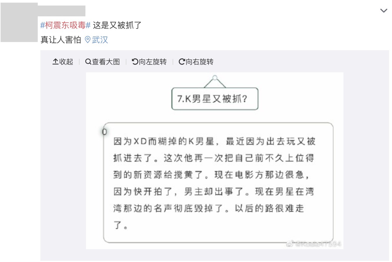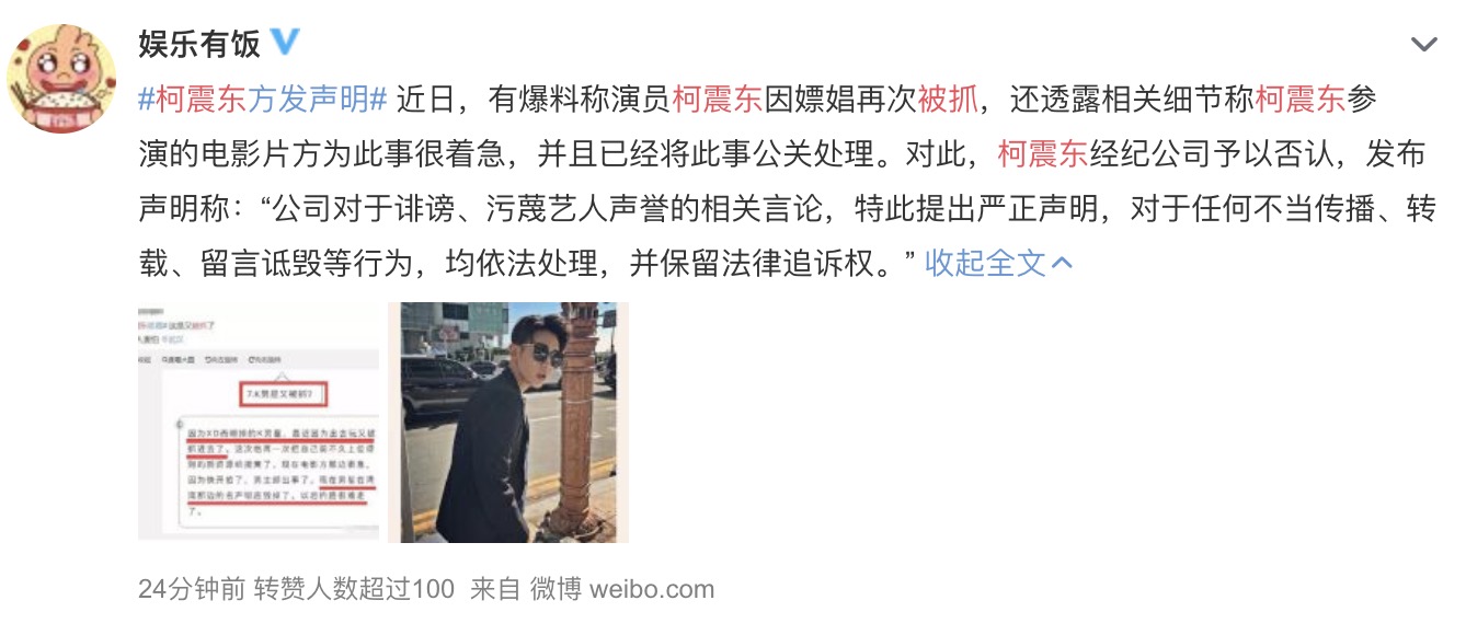 近日在微博上有眾多娛樂博主以及網友爆料指稱柯震東因嫖妓再度被抓,該位博主發出的圖片中使用K男星代稱柯震東,寫道:「因為XD而糊掉的K男星,最近因為出去玩又被抓進去了,現在電影那邊很急,因為快開拍了,男主卻出事了」,更表示男星在台灣的名聲已經徹底毀掉,斷言他「未來的路很難走」。然而根據《自由時報》報導指出,有中國媒體通過柯震東經紀公司取得聲明,經紀公司方面表示:「公司對於誹謗、污衊藝人聲譽的相關言論,特此提出嚴正聲明,對於任何不當傳播、轉載、留言詆毀等行為,均依法處理,並保留法律追訴權」,嚴正否認這次瘋傳入獄的傳聞。