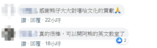發文一出,立刻引來許多網友支持,紛紛表示:「感謝熊仔大大對嘻哈文化的貢獻」、「真的很棒,可以開阿熊的英文教室了」,除此之外,台灣嘻哈先鋒「老莫(ILL MO)」也留言力挺:「這個系列很棒啊」。