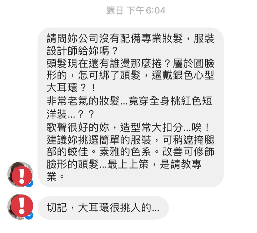 近日有一名網友留言給魏如萱,從貼文的截圖中可以看到網友說,「請問你的公司沒有配專業裝髮、服裝設計師給你嗎?頭髮現在誰還有燙那麼捲?屬於圓臉形的,怎可綁頭髮還戴銀色心型大耳環?非常老氣的妝髮...還穿全身桃紅色短洋裝?」不停的批評魏如萱全身上下的穿著打扮!