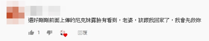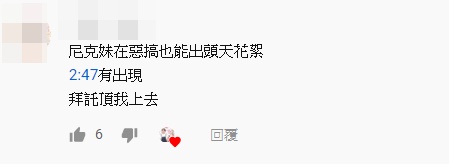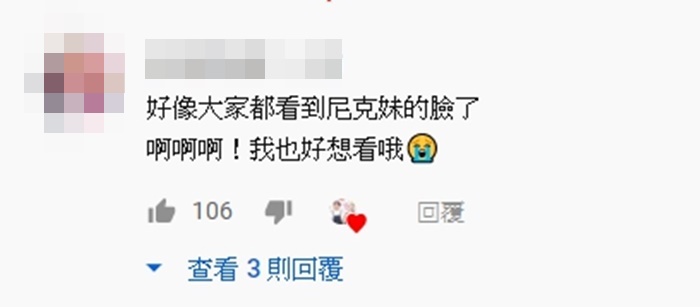 影片剛開始上傳,便有眼尖網友發現尼克妹妹意外露臉,紛紛留言表示,「尼克妹露臉了啦!」、「尼克妹真的正,好險第一次上傳有看到」、「好像大家都看到尼克妹的臉了」。另外也有網友指出過去尼克妹就曾在影片中出現,「尼克妹在惡搞也能出頭天花絮,2:47有出現」。