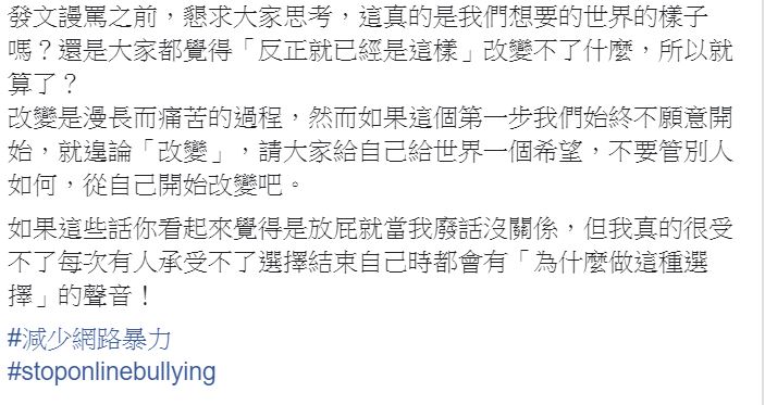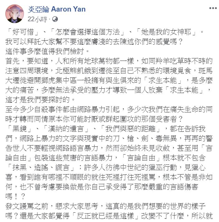 炎亞綸也進一步補充,希望網友在發文謾罵之前,都能先思考「這真的是我們想要的世界的樣子嗎?」,還是因為認為「反正就已經是這樣」,自己也改變不了什麼,「所以就算了?」文末,炎亞綸也呼籲粉絲,希望每個人都能踏出第一步,「從自己開始改變」,更表示「覺得是放屁就當我廢話沒關係」,但他真的很受不了每次當有人承受不了生活壓力,而選擇結束自己時,總是有「為什麼做這種選擇」的聲音產生。