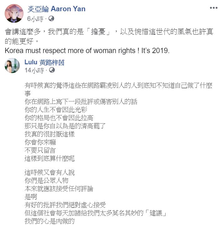 隨後,炎亞綸也轉發新生代主持人「Lulu黃路梓茵」的發文,表示自己會講這麼多,是因為「我們真的是擔憂」,也期許這世代的風氣也許真的能更好,用心良苦的發言獲得不少網友大讚。