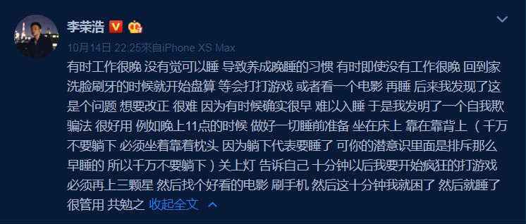 近日李榮浩在微博發文寫道,「因為工作的關係,有時工作很晚,沒有覺可以睡,就養成了晚睡的習慣,有時可能沒有很晚回家,在刷牙洗臉時就會開始想等等要打遊戲,還是看個電影再睡!」後來他發現這樣的狀態要調整回正常的狀態,是一件很難的事情,於是自己發明了一套「自我欺騙法」!