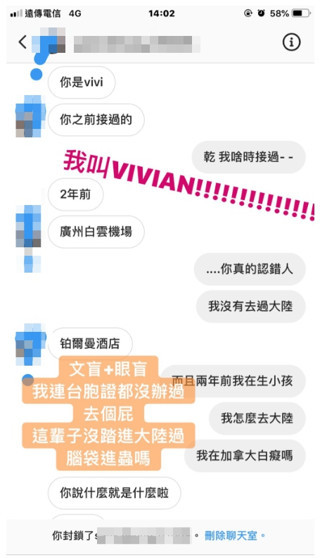近日,謝薇安在IG的限時動態中,PO出自己和一名經紀的對話。對方稱呼謝薇安為Vivi,並表示她2年前曾現身廣州白雲機場,更曾在酒店接過客。謝薇安雖然多次反駁,向對方表示自己不曾去過大陸,「你真的認錯人」,並且補充自己2年前正在生小孩,身在加拿大而非大陸。但是對方似乎不領情,怒酸:「你說什麼就是什麼啦」,讓謝薇安氣炸,PO出對話,除了表示:「我叫Vivian!」也怒批對方是:「文盲+眼盲」,澄清自己這輩子沒踏進大陸,連台胞證都沒辦過。