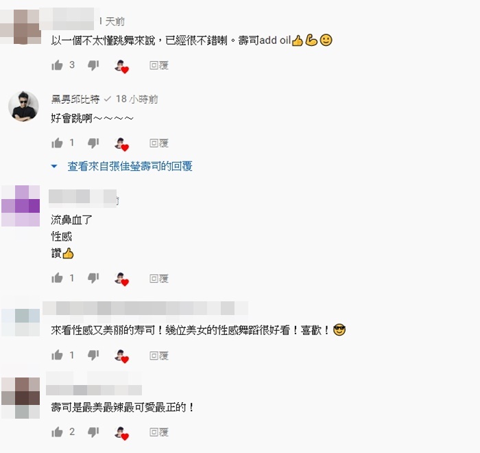 影片一出後,許多粉絲紛紛留言表示,「以一個不太懂跳舞來說,已經很不錯喇」、「流鼻血了!性感!」、「壽司是最美最辣最可愛最正的!」、「開頭就快招架不住了」、「越來越讚」。