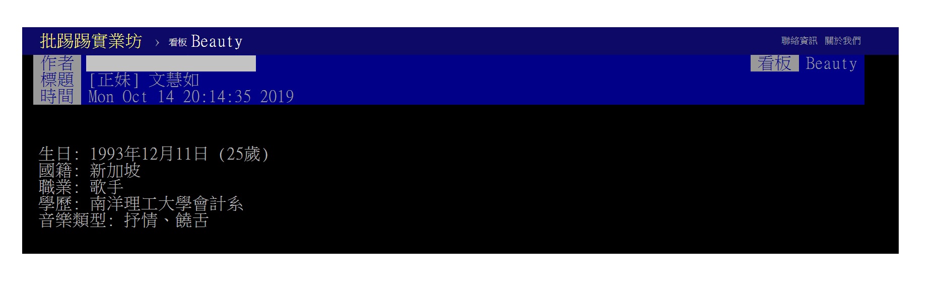 要成為一名受到觀眾歡迎的歌手、明星,除了自身須具備有實力之外,外型也常是吸引觀眾目光的關鍵,但是也絕非要有多令人驚艷或絕世無雙的顏值,有時「眼緣」勝過一切,有些人總讓人越看越喜歡,一見傾心,二見鍾情的情況也不是沒有的,近日,來自新加坡的歌手「文慧如」就被PTT的版民們大讚是「耐看型」的正妹歌手,引發議論。