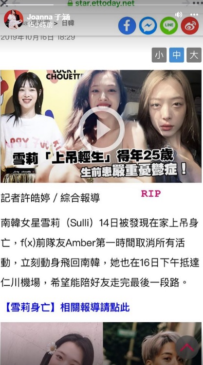 子涵昨天在臉書的限時動態發佈了一則「雪莉」的新聞截圖,並特別打了小小的「R.I.P.」放在截圖上,以表示悼念!相信大家都知道,南韓藝人雪莉在生前罹患了嚴重的憂鬱症,而且長期待在非常束縛的環境裡,再加上網路上各種言語霸凌,讓她最後承受不住,透過自我了斷來結束這25年的短暫人生,大大的衝擊了演藝圈,不少台灣藝人得知消息後,也紛紛發文痛斥網路霸凌!
