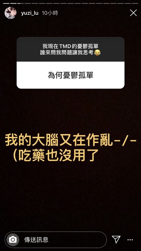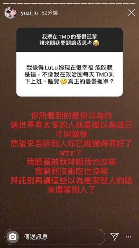 日前路路在限時動態上開放問答,同時她也寫下,「我現在TMD的憂鬱孤單,誰來問我問題讓我思考」透露出她心情的低落。此時卻有網友回覆,認為LuLu很幸福,能吃就是福,「不像我在政治圈每天TMD剩下上班、睡覺」覺得自己才是真正的憂鬱孤單。