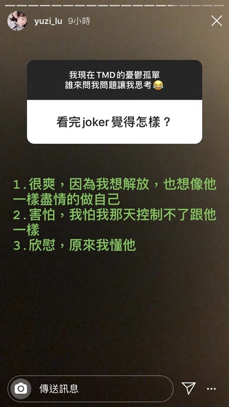 路路罹患憂鬱症已有一段時間,她也在限時動態中提到憂鬱孤單的原因,「我的大腦又在作亂,吃藥也沒用了。」同時路路也曝光看完電影《小丑》的心路歷程,「很爽,因為我想解放,也想像他一樣盡情的做自己。害怕,我怕我哪天控制不了跟他一樣。欣慰,原來我懂他」,可見電影引起路路的共鳴,也讓她心裡冒出許多情緒。