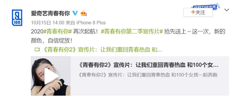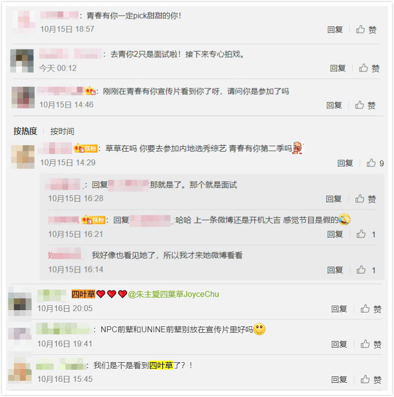 許多網友看完宣傳遍後,紛紛驚呼:「四葉草!」、「我們是不是看到四葉草了!」更有興奮的粉絲到四葉草微博中最新的貼文底下詢問:「你要參加《青春有你》第二季嗎?」,也表示:「《青春有你》一定PICK甜甜的你」!