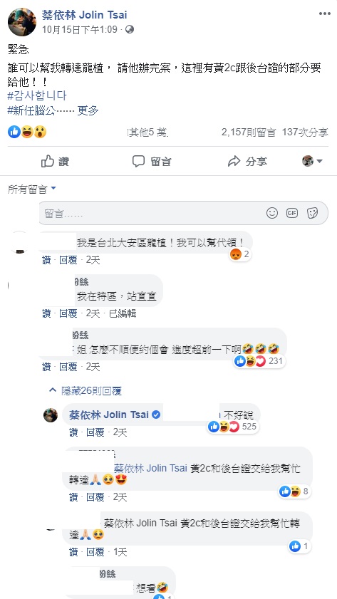 蔡依林在15日時候,在臉書突然發了一則「緊急」貼文,內容寫道,「誰可以幫我轉達龍植,請他辦完案,這裡有黃2C跟後台證的部分要給他!!」還逗趣的加了Hashtag「#新任腦公」、「#病得不輕」、「#喝杯咖啡不為過吧」、「#調皮鬼」,讓粉絲們都笑到不行,畢竟演唱會的票這麼難搶,呸姊竟要直接送給姜河那,讓人羨慕到不行!