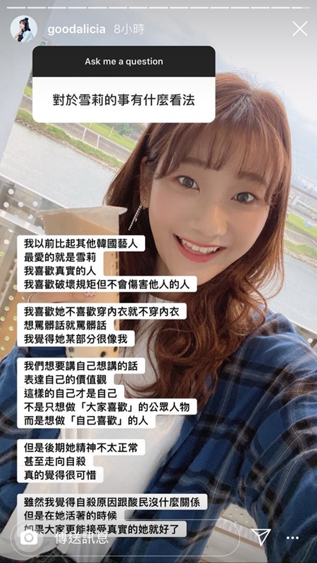 愛莉莎莎除了分享如何面對酸民,也提到對於韓國女星「雪莉」自殺事件的看法。愛莉莎莎透露,她非常喜歡真實的人,「表達自己的價值觀,這樣的自己才是自己,不是只想做大家喜歡的公眾人物,而是想做自己喜歡的人」。最後愛莉莎莎也認為,雪莉自殺原因跟酸民沒什麼關係,但如果她活著的時候,大家能更接受真實的她就好。
