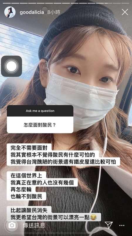 而日前愛莉莎莎在限時動態中開放問答,有網友詢問她如何面對酸民?她也大方分享內心想法,「完全不需要面對,其實不覺得酸民有什麼可怕的,我覺得台灣醜陋的街景還有鐵皮屋還比較可怕」。愛莉莎莎也豁達地認為,世界上真正在意的人也沒有幾個,「再怎麼輪,也輪不到酸民!」