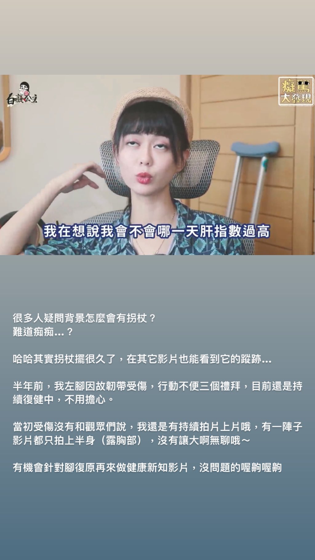 白癡公主表示,其實拐杖已經擺很久了,在其他影片也曾竟出現過,也特地呼籲粉絲:「不用擔心」。而對於背景出現拐杖,白癡公主也解釋,自己在半年前,左腳因為韌帶受傷的關係,有3個星期行動都相當不便,甚至到現在仍持續復健,所以才會在影片的背景中看到拐杖。