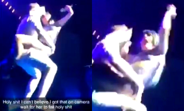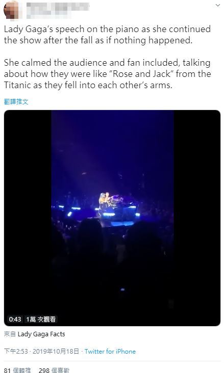 而男粉絲第一時間打算單腳踩住階梯,卻仍然無法站穩一屁股蹬到舞台邊緣,最後整個人壓在女神卡卡的身上兩人雙雙跌到觀眾席,想必女神卡卡的頭部一定相當疼痛,而掌鏡粉絲目睹一切過程尖叫聲也從歡騰到驚恐,同時直呼「天啊,我不敢相信我會用鏡頭等到他摔倒的這一刻」。