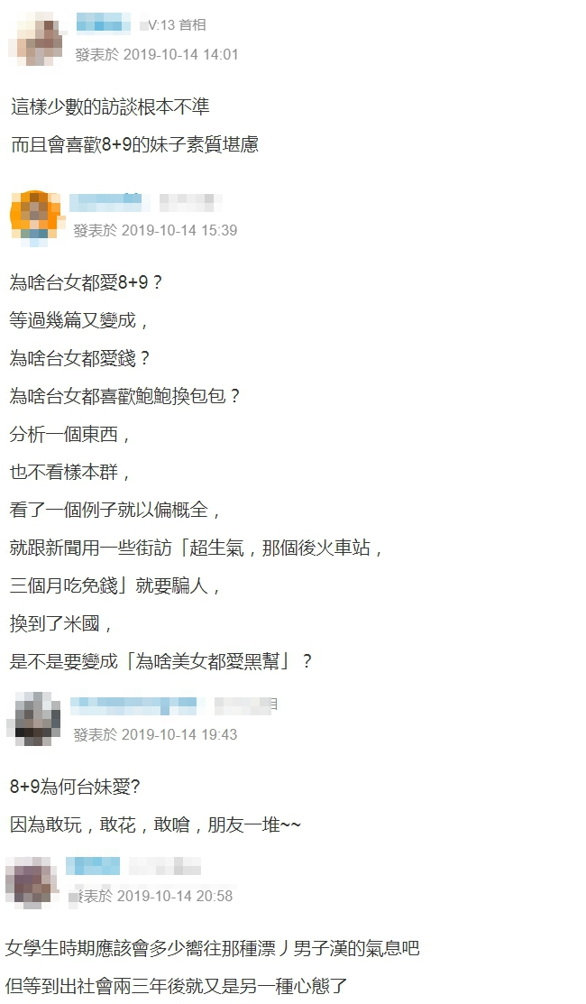 除了Barbie的回答,在論壇上也有不少網友相爭參與討論,並表示:「這樣少數的訪談根本不準,而且會喜歡8+9的妹子素質堪慮」、「為啥台女都愛8+9?等過幾天又變成,為啥台女都愛錢?為啥台女都喜歡鮑鮑換包包?分析一個東西,也不看樣本群,看了一個例子就以偏概全,就跟新聞用一些街訪『超生氣,那個後火車站,三個月吃免錢』就要騙人,換到了米國,是不是就要變成『為啥美女都愛黑幫?』」、「8+9為何台妹愛?因為敢玩、敢花、敢嗆,朋友一堆~」、「女學生時期應該都會多少嚮往那種漂丿的男子漢的氣息吧,但等到出社會兩三年後就又是另一種心態了」。