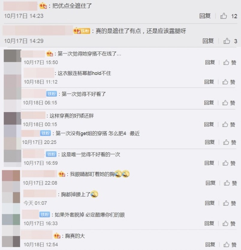 楊冪17號時現身北京機場身穿一件黑色的西裝外套,而在外套內她穿了一件水藍色的針織衫,下半身穿了高腰的黑色皮褲搭配球鞋,整體造型相當休閒帶有一絲酷帥的氣息,而針織衫U領的設計露出了大片白皙的肌膚,而這件衣服卻讓楊冪的胸型看起來有些下垂,再加上高腰褲的視覺效果,讓楊冪的胸部看上去像垂到了腰間,造型有些NG,而許多網友認為楊冪這套造型把纖細長腿以及身體曲線都遮蓋住,原先的身材優勢都被遮住了,紛紛留言表示:「把優點全遮住了」、「真的是遮住了有點,還是應該露腿的」、「第一次覺得不好看」、「胸都掉到腰上了」,引起許多網友吐槽。