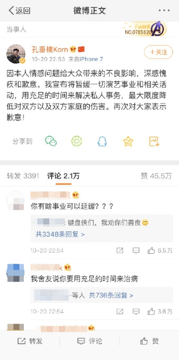 而在該網友附上的音檔中,有男性的聲音表示:「如果要把這種事情說出來,一是覺得丟人,二是覺得妳肯定會膈應我,會跟我分手,我才選擇沒說。」隨即遭到女聲反駁:「那到現在這種情況呢?已經談婚論嫁了,我沒得選,我不知道怎麼選,選了都是傷害我付出的感情。」在爆料一出後,立刻在網上引起軒然大波,孔垂楠工作室也發表聲明,承認2人是戀愛關係,「張女士在與孔垂楠戀愛前,已患有抑鬱症,情緒不甚穩定。2人戀愛後,由於張女士對於孔垂楠藝人身份的工作性質不甚認同,雙方經常為此爭吵。戀愛期間,女方因對感情缺乏安全感,多次臆想孔垂楠私生活混亂等諸多不道德行為,並對臆想深信不疑,甚至出現以自殺要挾孔垂楠放棄演員職業的情況。」,而孔垂楠本人也發出聲明,表示將暫緩一切演藝事業和相關活動,但未獲得網友諒解。