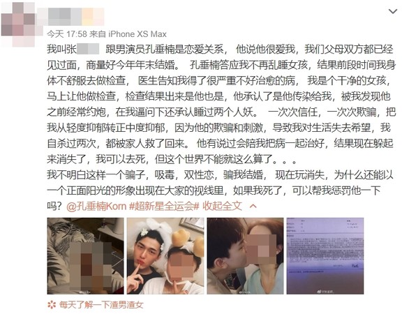 近來,有一名張姓女網友20日在微博爆料,指稱孔垂楠不但說謊成癮,還有吸毒的惡習,除此之外,他還經常約炮,甚至將病傳染給自己,並PO出一段錄音佐證。該女子表示,自己叫張孟妍,是孔垂楠的女朋友,雙方已經論及婚嫁,父母也都已經見過面,原本預計今年底就要結婚,結果最近因為不舒服,所以去看醫生,卻發現自己居然染病了,在檢查後發現是原來是被男友傳染,讓她氣到忍不住在網上怒控對方,並表示:「如果我死了,可以幫我懲罰一下他嗎?」