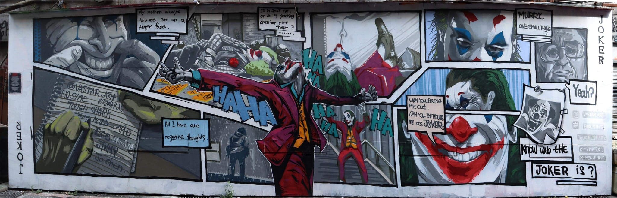 這幅《小丑》漫畫牆位於西門町電影主題公園中,藝術家「傅星翰」在這裡創作了獨一無二的塗鴉作品,他在受訪時提到,在這一次創作中,最令他難忘的是「夥伴們」,因為這次創作是在電影上映前就畫好了,「我自己本來就很喜歡這個角色,在還沒看電影之前就靠著預告釋出的畫面自行創作,而我的夥伴們後來知道我快趕不及畫完,還特地跑來幫忙,讓我覺得很感動!」
