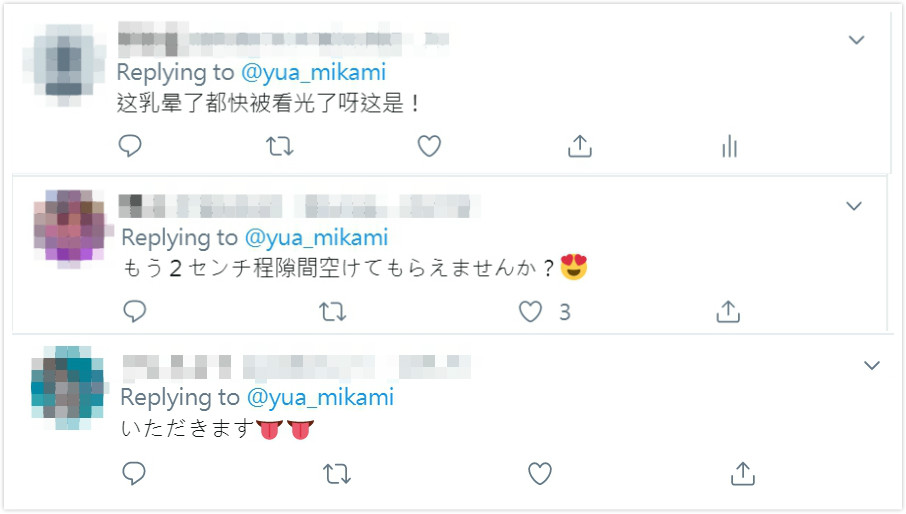 三上悠亞非但全裸入鏡,還未做防護措施,讓粉絲紛紛替她捏了一把冷汗。雖然三上悠亞坐在浴缸中,巧妙用曲起的兩腳遮掩重點部位,但因為她一手拿著攝影器材的關係,導致右半球直接大片露出,甚至隱約可見胸前陰影,讓粉絲紛紛直呼: 「可以再留出約2厘米的間隙嗎?」、「乳暈都快被看光了」,更有粉絲興奮表示:「我要開動了!」,十分引人遐想。