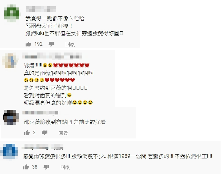 對此有許多粉絲在影片底下,針對邵雨薇變瘦留言:「邵雨薇太正了好瘦!雖然KIKI也不胖但在女神旁邊臉變得好圓」、「看到封面真的嚇到,超級漂亮但真的好瘦」、「邵雨薇臉瘦到有點凹之前比較好看」、「感覺雨薇變瘦很多!!臉頰消瘦不少...跟演1989一念間 差蠻多的!!!不過依然很正!!!」