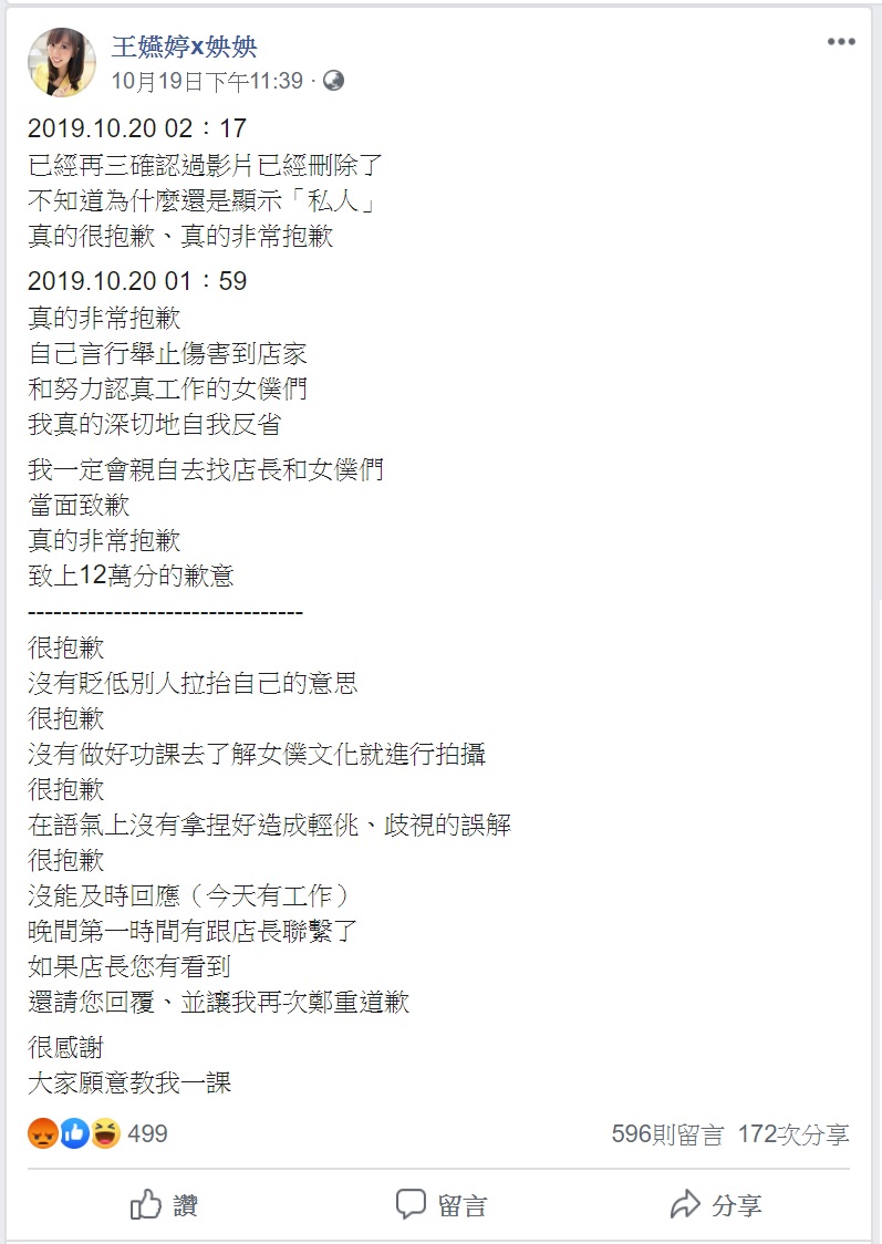 而在影片上架,事件爆發之後,「王嬿婷」及店家都各自在臉書上發佈貼文表明立場,先是「王嬿婷」在臉書上PO出道歉文,文中寫道「真的非常抱歉,自己言行舉止傷害到店家,和努力認真工作的女僕們,我真的深切地自我反省」,更表示會親自向店家和女僕們道歉,為自己不禮貌的行為致歉。