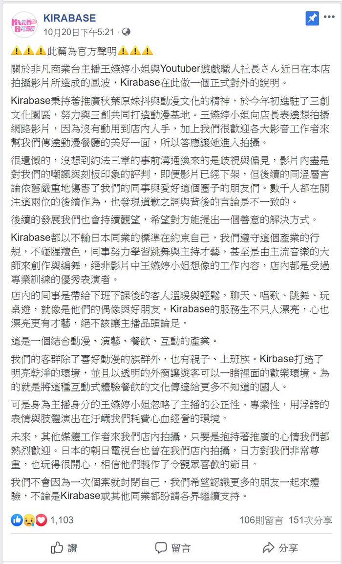 隔日,店家也鄭重地發表了聲明,透露原先是基於推廣「女僕文化」的原則,而答應拍攝,卻沒想到卻遭受如此不勘的偏見和歧視,直言「即便影片已經下架,但後續的同溫層言論依舊嚴重地傷害了我們的同事與愛好這個圈子的朋友們」,接著更直批「王嬿婷」沒有善盡主播的公正性和專業,而是以誇張的肢體演出和言語來抹滅「女僕餐廳」,並沒有鬆口原諒對方。