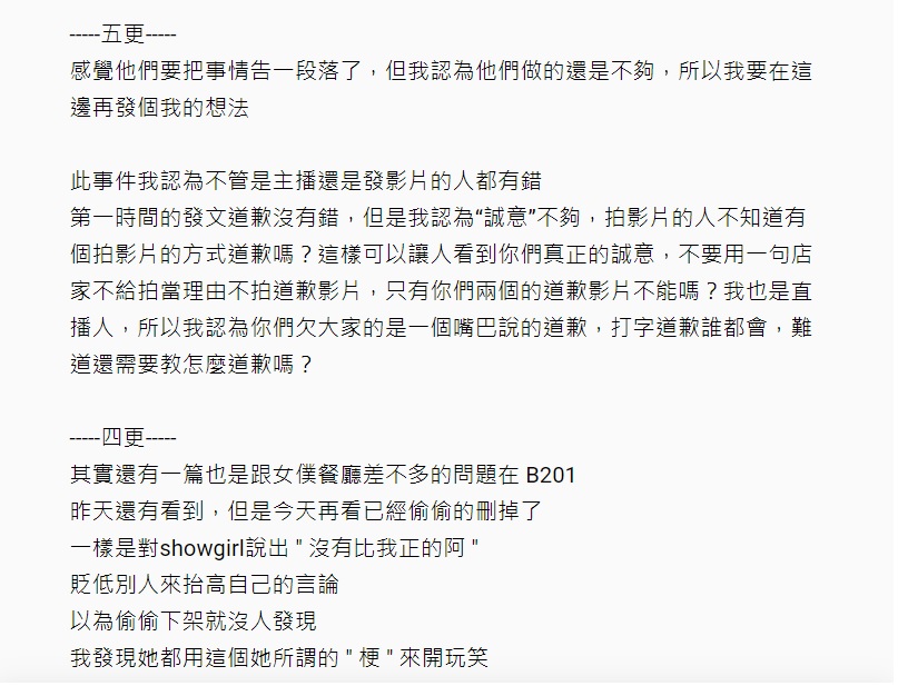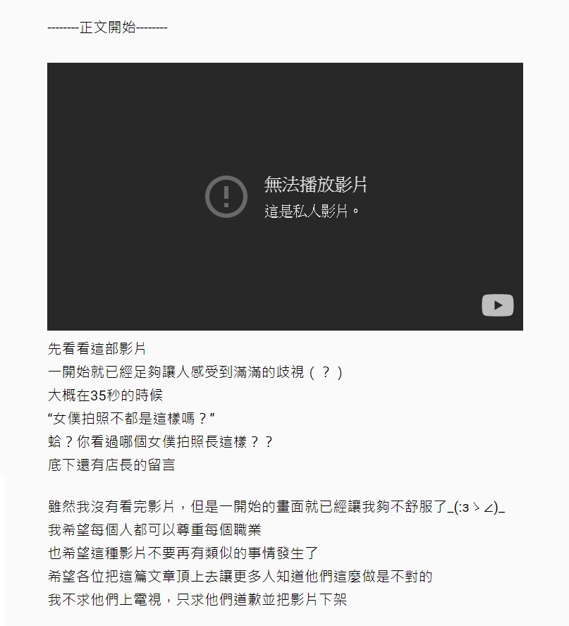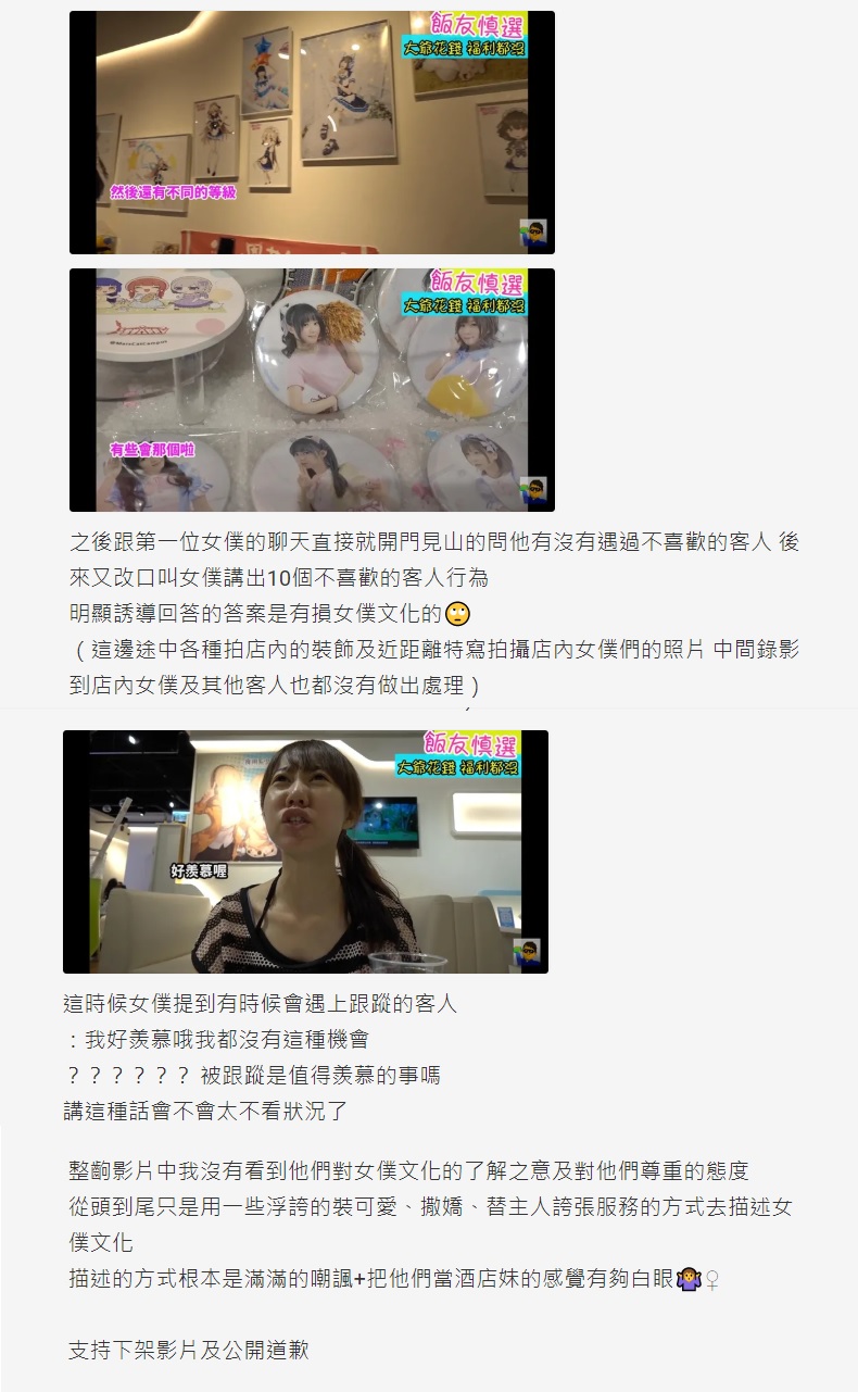 除此之外,也有網友在留言區PO出已遭刪除的影片截圖,直指「王嬿婷」從影片一開始就故意搔首弄姿,醜化「女僕」形象,之後更多次對餐廳內的「女僕」提出不禮貌的問題和說出不合宜的話,讓網友怒道「描述的方式根本是滿滿的嘲諷+把他們當酒店妹的感覺有夠白眼」,引發眾怒。