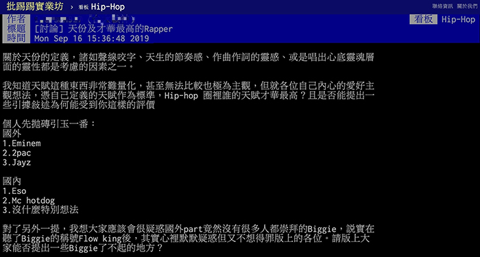 台灣嘻哈音樂起源約於30年前由黃立成、黃立行以及林智文組成的團體「L.A. Boyz」將街舞、嘻哈音樂取樣引進台灣,成為台灣最早唱華語R&B和嘻哈的先驅,接著在2000年開始出現了「熱狗(MC Hot Dog)」與大支,開始發展華語嘻哈,然而在去年金曲獎頒獎典禮上,包含:大支、Leo王、ØZI、葛西瓦、頑童等嘻哈歌手,以及剃刀蔣、陳星翰等嘻哈背景音樂人,都繳出亮眼的入圍成績,華語嘻哈持續快速發展中。近日,PTT嘻哈版上就有網友開始討論起「天份及才華最高的Rapper」,大家也紛紛選出心中的第一名。