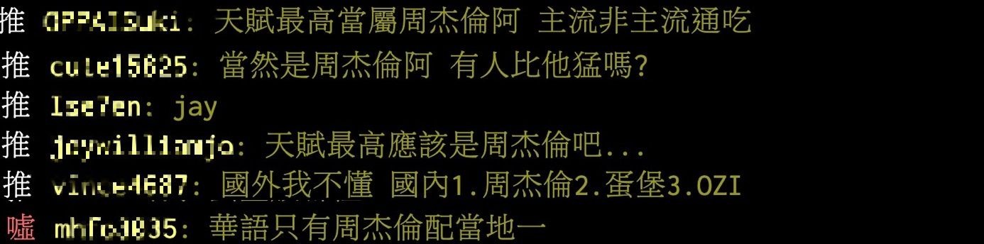 除了蛋堡之外,天王「周杰倫」的呼聲也非常高,周杰倫在2001年時以一首《雙節棍》展現了驚人的Rap實力,該首歌曲更廣被傳唱,之後周杰倫陸續推出的歌曲像是:《忍者》、《龍拳》、《霍元甲》都是充滿中國風的說唱歌曲,鄉民們也紛紛留言:「天賦最高當屬周杰倫阿 主流非主流通吃」、「當然是周杰倫阿 有人比他猛嗎?」、「天賦最高應該是周杰倫吧」,ØZI也成為第三呼聲高的歌手。