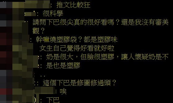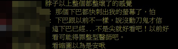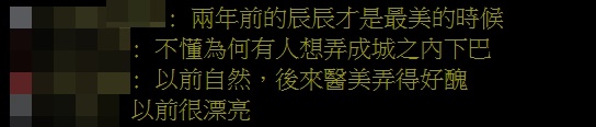 不少網友在文章下方留言表示,「她的下巴越來越誇張」、「兩年前的辰辰才是最美的時候」、「幹嘛燒塑膠袋?都是塑膠味」、「這個下巴是修圖修過頭?」、「我覺得以前比較沒名氣的時候比較好看ㄝ」、「下巴可以開罐頭了」、「那個下巴都快刺出我的螢幕了,怕」、「脖子以上整個都整壞了的感覺」。