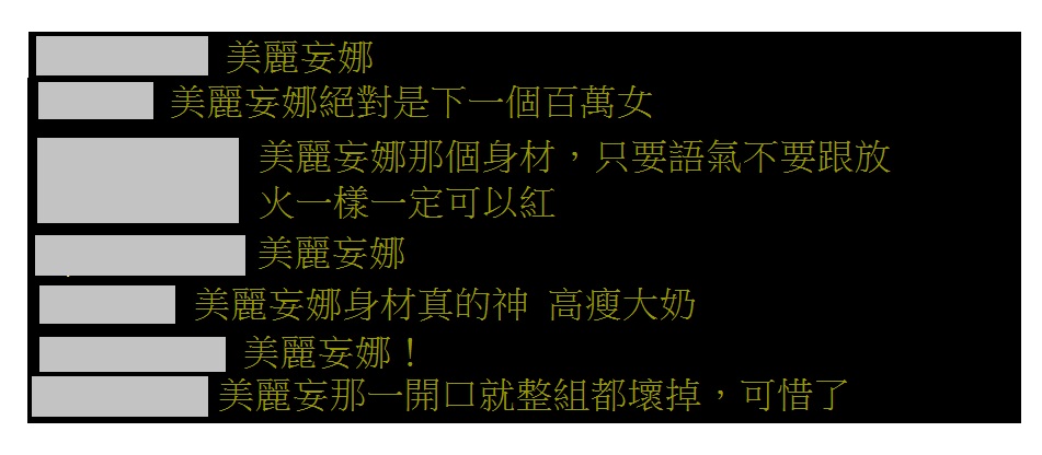 首先是以火辣身材,加上自然不造作的性格而受網友喜愛的「美麗妄娜」,鄉民們大多認為「美麗妄娜」外型亮眼、身材又好,只要影片形象不差、口條再加強,一定能成功。除此之外,也不忘大讚「美麗妄娜絕對是下一個百萬女」「美麗妄娜身材真的神,高瘦大奶」「美麗妄娜那個身材,只要語氣不要跟放火一樣一定可以紅」。