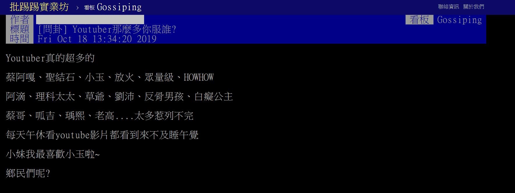 近日,在PTT的八卦版上有網友提問「Youtuber那麼多,你服誰?」,更洋洋灑灑地列舉了許多知名的Youtuber,更笑稱「每天午休看youtube影片都看到來不及睡午覺」,由此可以看出原PO似乎是個Youtube成癮者,最後她則大方表白,直呼「小妹我最喜歡小玉啦~」,引發許多網友議論。