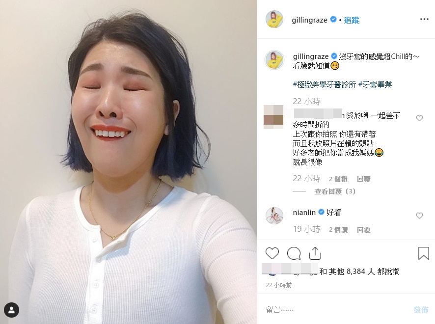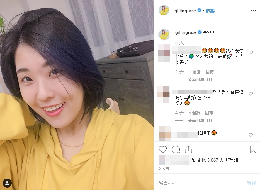 木星日前在IG分享生活照,露齒微笑的她,讓粉絲們從中找出亮點,而網友們立刻發現木星的牙套不見,紛紛留言表示「拆完牙套變更漂亮了」、「無牙套的木星」。而木星隔幾天後,公布上一張照片的解答,「沒牙套的感覺超Chill的~看臉就知道」只見木星露出上排牙齒,一臉享受的浮誇表情,瞬間逗笑粉絲!