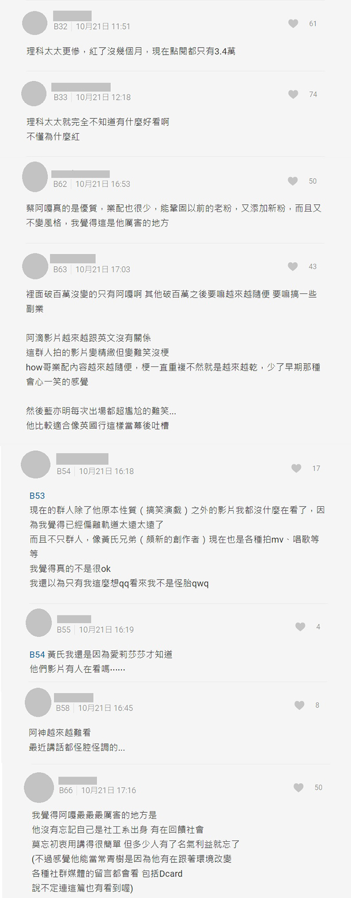 除此之外,更釣出不少網友列舉了其他過氣或不如以往的Youtuber,如前段時間迅速竄紅的「理科太太」、以業配出名的「HOWHOW」、國民暖男「阿滴」、「黃氏兄弟」、「這群人」等人,讓網友大嘆「破百萬沒變的只有阿嘎啊」。