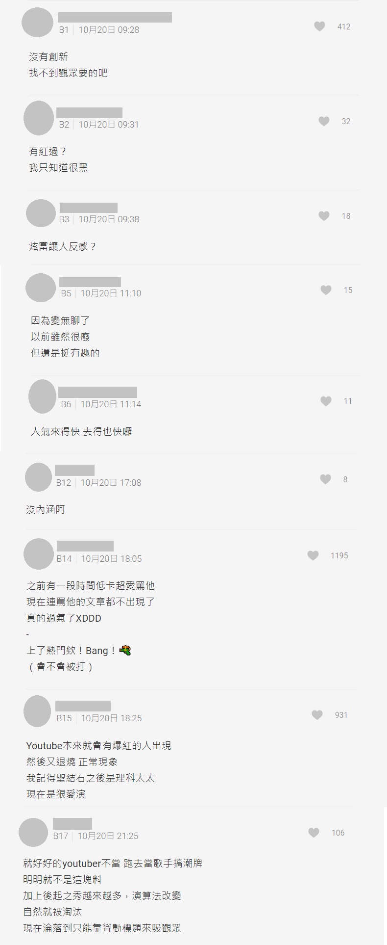 對此其他網友們則直言不諱地表示「聖結石」不像從前一樣那麼純粹了,甚至跨足出單曲、做潮牌,影片也變無聊,以前比較好笑,而且又沒有內涵、不能創新自然就會被淘汰,更有網友坦言「炫富讓人反感?」「人氣來得快,去得也快囉」「以前雖然很廢,但還是挺有趣的」,直指問題核心。