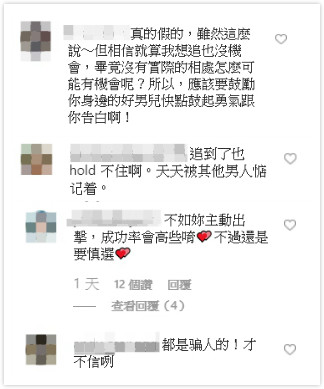 發文一出,立刻引起網友廣大的迴響,紛紛留言直呼:「都是騙人的!才不信咧」、「追到了也hold 不住啊。天天被其他男人惦記著。」但也有網友建議:「不如妳主動出擊,成功率會高些唷,不過還是要慎選」、「真的假的,雖然這麼說~但相信就算我想追也沒機會,畢竟沒有實際的相處怎麼可能有機會呢?所以,應該要鼓勵你身邊的好男兒快點鼓起勇氣跟你告白啊!」