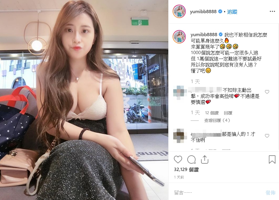 雖然Yumi.k的身材火辣,外貌也十分出眾,作風也相當活潑大膽,但最近似乎鮮少桃花,讓她不禁在IG上吐露心聲,表示:「我也不敢相信我怎麼可能單身這麼久」,更進一步解釋:「1000個說怎麼可能一定很多人追,但1萬個說這一定難追不要試最好。」最後更調皮反問網友:「所以你說說呢,到底有沒有人追?」,這張照片更是吸引了上萬人按讚。