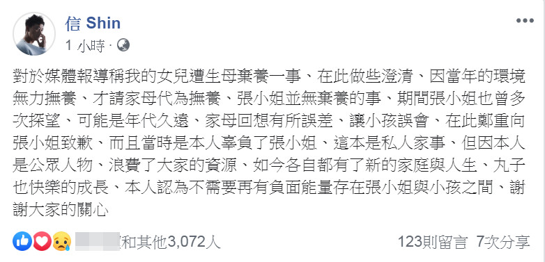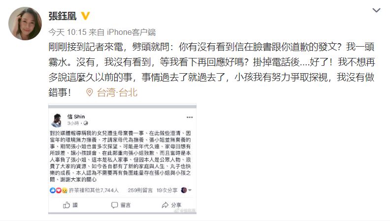 如今重提往事,說法卻與當年有所出入,引發網路熱烈討論。而信也在23日時,特地在臉書上發文澄清,表示張鈺凰並沒有棄養,期間也多次探望,「可能是年代久遠,家母回想有所誤差,讓小孩誤會,在此鄭重向張小姐致歉。」而也有媒體致電張鈺凰詢問,張鈺凰則直爽表示:「好了!我不想再多說這麼久以前的事,事情過去了就過去了,小孩我有努力爭取探視,我沒有做錯事!」