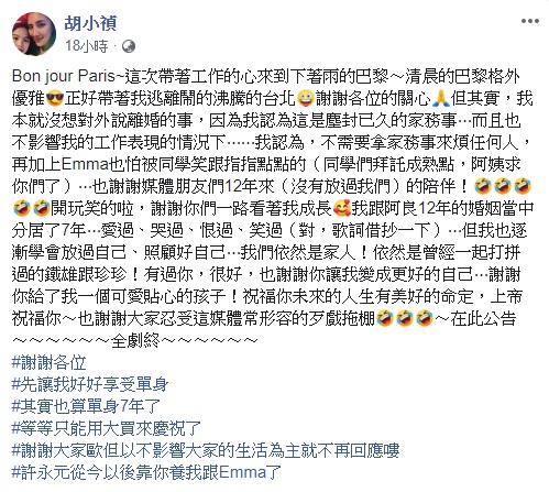 此外,小禎直播時也一直笑說,「真的是感謝主,還好我們出國了...但回去還是得面對~」而她也在臉書發文中提到,「還好這次因為工作的關係飛到了巴黎,正好逃離鬧得沸騰的台北,謝謝各位的關心,但其實,我本來就沒想對外說婚姻的事,因為我認為這是塵封已久的家務事...而且在不影響我工作表現的情況下,我認為不需要拿家務事來煩任何人!」