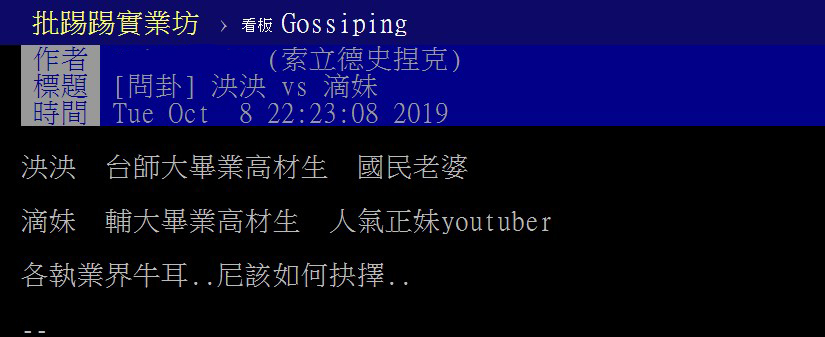 PTT八卦版上有網友問卦,以「泱泱VS滴妹」為標題詢問鄉民們的看法,原Po在文中分別分析了兩位的學歷跟在各方面的代表稱號,泱泱為台師大畢業高才生,AKA「國民老婆」;滴妹畢業於輔大高材生,為當紅人氣正妹Youtuber,並且都在各自的圈子有著不錯的發展,最後原PO以「各執業界牛耳..尼該如何抉擇..」來詢問其他網友的意見。