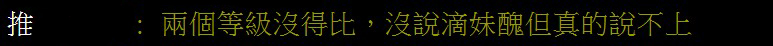 另外也有部分網友表示「滴妹不醜啊,但你硬要跟正妹比較…」,為滴妹喊屈,滴妹一開始是在幕後幫哥哥「阿滴」拍片,因為魔性的笑聲獲得粉絲們青睞,粉絲們公認滴妹的笑聲才是阿滴影片靈魂,這次的比較被網友以「不是同個 level 吧」、「藝人 vs 普妹?」「不同路線、風格的人怎比」畫下句點。