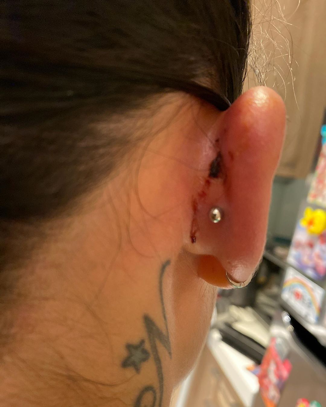 後來想說都擦完藥也換了針,應該過幾天就會好了,殊不知到了23日那天,她的耳朵又痛到爆,整個痛的感覺還從耳朵延伸到了頭皮!好朋友王思佳得知這件事,趕緊提醒她「這嚴重可能導致蜂窩性組織炎,趕快去看醫生!」於是梁云菲跟金剛兩人趕緊跑去就醫。