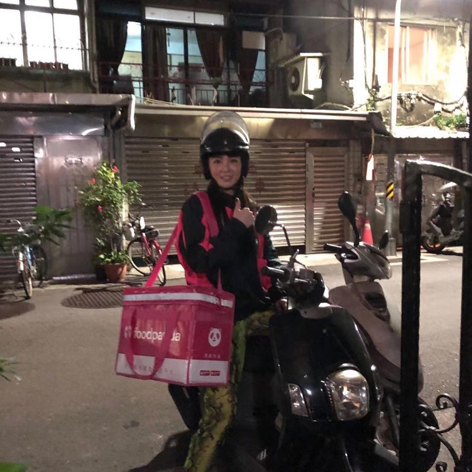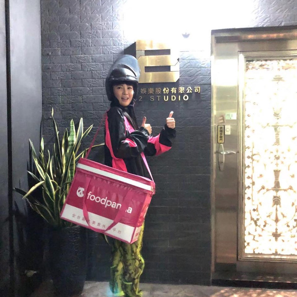 舒子晨23日在臉書上PO出兩張自己背著熊貓外送箱的照片,不仔細看,真的會以為是專業的正妹熊貓外送員,照片一出,就引起廣大迴響!舒子晨表示,這不是業配啦~只是自己剛好在公司看到熊貓的標準配備「外送寶箱」,因此一時興起,決定體驗看看。而舒子晨也相當專業,不僅戴著安全帽站在機車旁,將安全帽蓋掀起,也有模有樣地站在公司門口前,開心地比出「讚」的手勢,頗有外送員的架式。